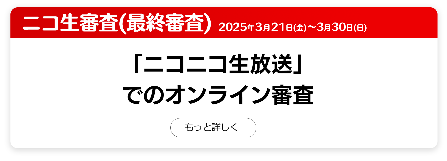 ニコ生審査(最終審査):2025年3月21日(金)12:00~3月30日(日)23:59まで(ニコニコ生放送上にて)